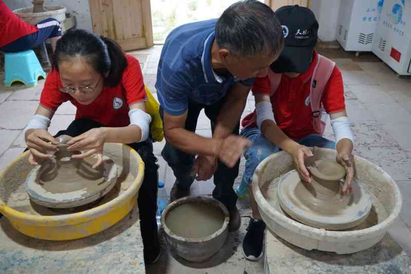 潜山市痘姆乡素有“千年陶瓷之乡”的美称,陶器手工技艺距今已有6000多年的历史,堪称制陶史上的活化石。走进痘姆古陶,首先映入眼帘的是建于清代的龙窑,每个入火口都堆积了许多柴火,近处可感受到火的炙热温度。走进屋内,可见众多精美的古陶制品摆放在木架上,富有文艺复古气息。营员们在陶艺师傅的指导下,亲自体验了制胚过程,看到自己亲身制作的泥坯作品展示在眼前时,无不兴奋激动,这既能感受到传统文化的艺术魅力,也能激发他们争做非物质文化遗产继承人的决心。