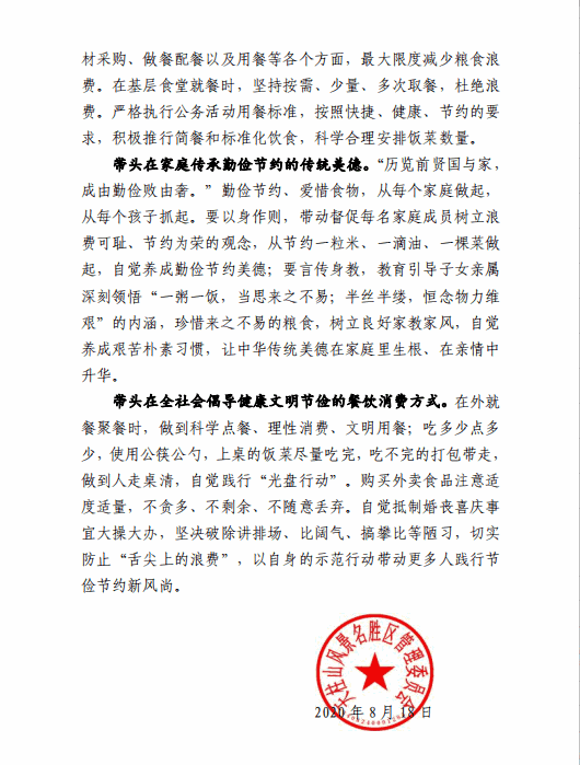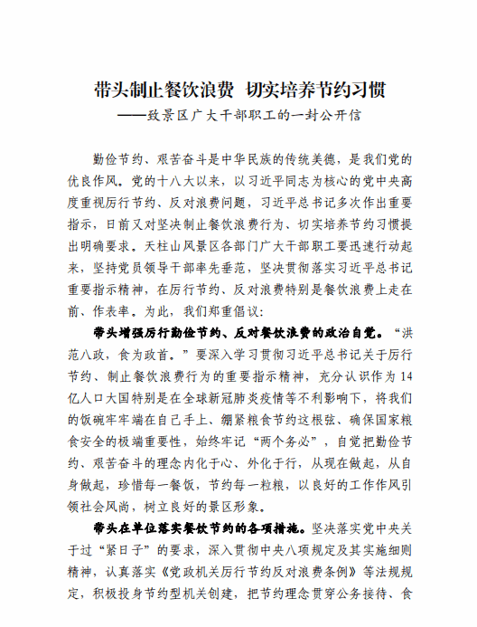 带头制止餐饮浪费 切实培养节约习惯 ——致景区广大干部职工的一封公开信
