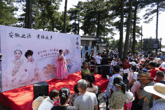 在游客服务中心及大龙窝索道上站广场,多场黄梅戏连台演出,台上演员与台下游客频繁互动,婉转悠扬的黄梅乡音在山谷间荡漾,广大游客沉醉其中,真切感受到了“树上的鸟儿成双对,绿水青山带笑颜”的意韵。