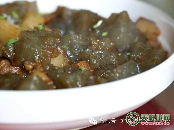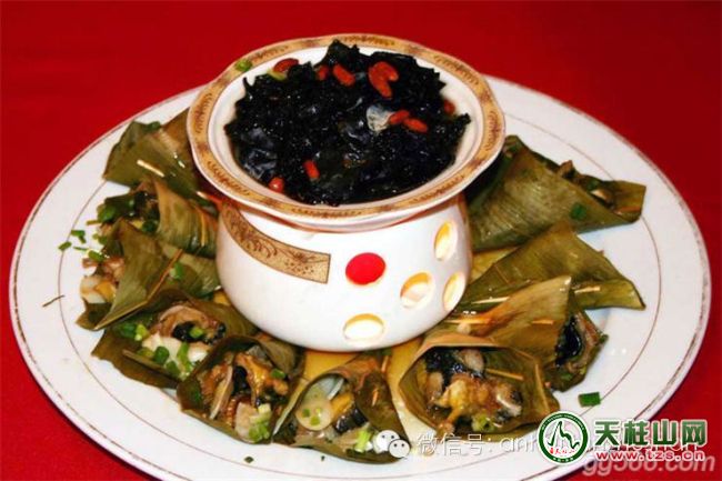 特色: 石耳炖老鳖 特点:汤清、味鲜香、鳖酥烂,具有清凉驱火之功效。天柱农家腊肉 农家腊味——柴火蒸腊肉(当地农人自养的黑公猪肉)